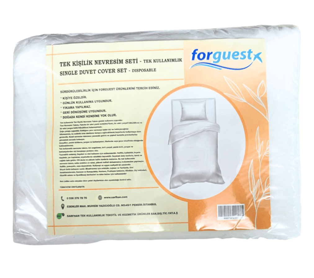 Bu tek kullanımlık nevresim takımı, seyahatlerinizde ve otel konaklamalarınızda temiz, hijyenik ve konforlu bir uyku deneyimi sunar. Set, bir adet yastık kılıfı, bir adet çarşaf ve bir adet yorgan kılıfından oluşur.