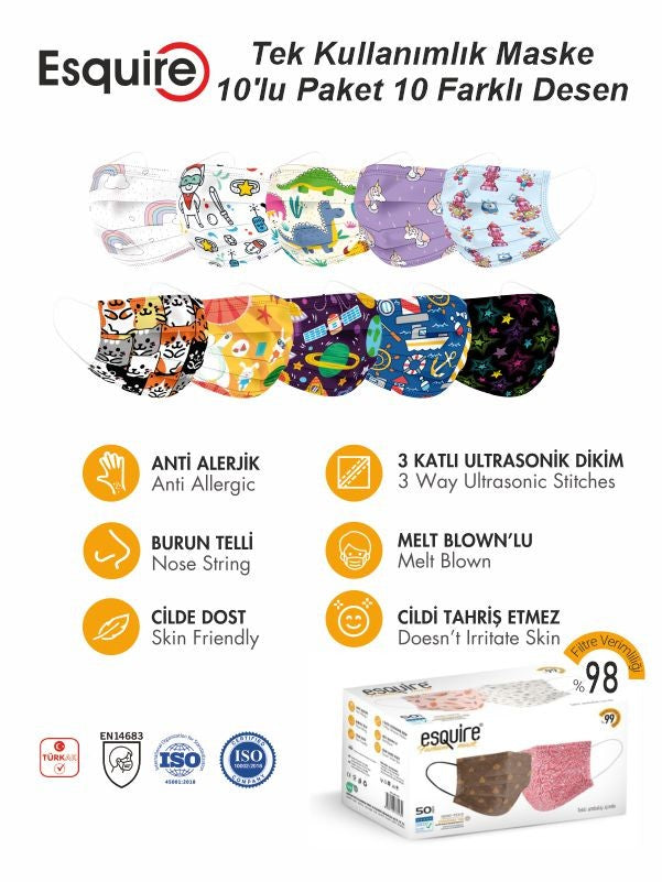 | ESQUIRE Baskılı Tek kullanımlık Maskeyi diğer cerrahi maske lerden ayırn özellikler; Esquire maskenin 1.Kat dış baskılı yüzeyi Sertfikalı 40gr/m2 Teknik kumaş, 2. Ara kat 25 gr/m2 %99 Filteleme özeliği olan Orjinal sertifikalı MELTBLOW, 3. Kat'da Yüze temas eden Ojinal spunbond 25 gr/m2 lik Teknik kumaşların birleşiminden toplmd 90 gr/m2 den oluşmaktadır. Piyasadaki çoğu 3 katlı Cerrahi maskeler 3 kat 25gr/m2 Teknik kumaşın birşiminden toplamda 75 gr/m2 den üretilmektedir. Esquire Baskılı Maskelerimiz;